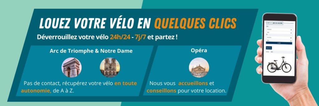 Nous disposons de trois points de location situés proche de l’Arc de Triomphe, de Notre Dame et de l’Opéra. Trois lieux incontournables pour démarrer sa balade à vélo et rejoindre ensuite les principales attractions de Paris.